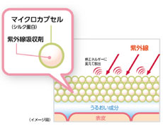 紫外線吸収剤をマイクロカプセル内に閉じ込めて、肌に直接触れさせない日焼け止め乳液。